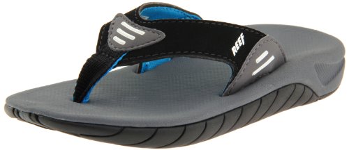 This hardy little flip flop from Reef makes a great at-the-ready, by-the-backdoor shoe, perfect for outdoor play and ideal for trips to the lake or beach. Constructed with a durable and colorful synthetic leather upper, the Slap is equipped with padded and lined straps for comfort, a cushy, molded footbed for built-in arch support, and (for smaller sizes only) a back strap to keep it from coming off. The soft, nylon thong post is easy on the toes, and the non-skid rubber sole provides stability on damp or slippery surfaces.
