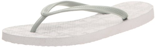 Plain sandals go a long way. Silver metallic foot straps with brand name featured. Brand logo imprinted on foot bed. Multiple brand logos imprinted on rubber out sole.
